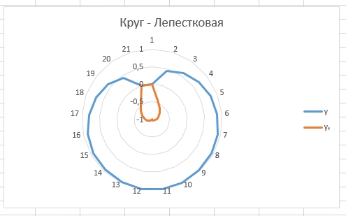 Формула для yберется с положительным значением, для y1 с отрицательным значением. Теперь строим заданные графики: График, Точечная диаграмма, Лепестковая диаграмма. Они представлены на рисунках 14,15 и 16 соответственно.