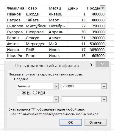 Выбираем нужный параметр фильтрации и вводим условия фильтрации. Если нам нужно отобразить числа превышающие определённое значение, надо выбрать пункт больше или равно и ввести это значение, в заголовке столбца который нужно отфильтровать. Действия с фильтром со значениями И, ИЛИ представлены на рисунках 19 и 20. На рисунке 19 мы видим применение таблицы необходимых фильтруемых значений, в данном случае отфильтрованы, автомобили, превышающие цену 750 тысяч рублей. При нажатии на клавишу ОК, Ecel автоматически отфильтровывает автомобили данной ценовой категории. И уже на рисунке 20 мы видим таблицу с необходимыми нам данными. В этой таблице мы видим автомобиль дорогой ценовой категории.