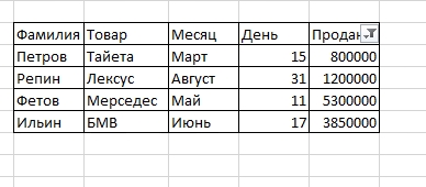 Таблица данных Таблица фильтра Знак фильтра