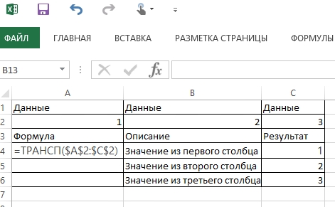 Чтобы функция ТРАНСП работала правильно, формулу в этом примере необходимо ввести как формулу массива. После копирования этого примера в пустой лист выделите диапазон A4:A6, начиная с ячейки, содержащей формулу. Нажмите клавишу F2, а затем — сочетание клавиш CTRL + SHIFT + ВВОД. Если формула не будет введена как формула массива, единственное значение будет равно 1.