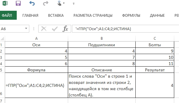 ГПР(искомое значение, таблица, номер строки, [интервальный просмотр])