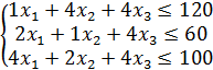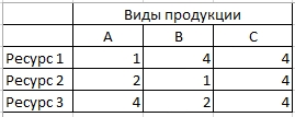 Пусть некоторое предприятие производит три вида продукции: x1, x2, x3 (таблица 1). На производство затрачивается три вида ресурсов. Запасы ресурсов на складе (таблица 2). Цена каждого из видов продукции (таблица 3).