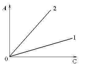 Например, при фотометрическом определении Fe3+ используют его поглощающие свет комплексы с тиоцианат-ионами SCN– или анионами сульфосалициловой кислоты C6H3(OH)(COOH)SO3–. Из рис. 1. следует dА2/d(C) > dА1/d(C). Таким образом, второй метод чувствительнее первого.