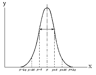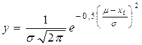 где y – плотность вероятности распределения случайной величины хi; μ – математическое ожидание (среднее арифметическое значение для генеральной совокупности); σ – среднее квадратичное отклонение (расстояние от μ до проекции точки перегиба на ось х).