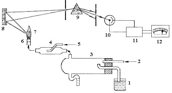 1 – анализируемый раствор; 2 – подача воздуха от компрессора; 3 – распылитель; 4 – отстойник-смеситель; 5 – подача природного газа; 6 – горелка; 7 – пламя; 8 –зеркало-конденсор; 9 – монохроматор (светофильтр); 10 – фотоэлемент; 11 – усилитель; 12 – миллиамперметр