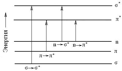 Наибольшей энергии требует переход σ → σ*, связанный с возбуждением внутренних электронов. Он соответствует поглощению в дальней ультрафиолетовой области (λ < 200 нм, Е> 600 кДж/моль). Для перехода n→ σ* необходимы меньшие затраты энергии. Полосы, вызванные переходом, расположены в ультрафиолетовом диапазоне с величиной λ = 200...300 нм. Еще меньшая энергия соответствует переходу на разрыхляющие π*-орбитали. Переходы n → π* и π → π* встречаются в молекулах соединений с сопряженными связями и молекулах ароматических соединений. Именно переходом с несвязывающей орбитали атома кислорода на разрыхляющую n → π* объясняется интенсивная окраска ионов МnО4– и СrО42–.