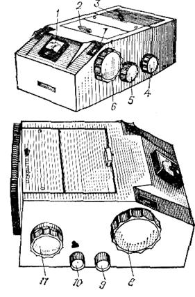 Если при работе с некоторыми светофильтрами поступающий на фотоэлементы световой поток оказывается чрезмерно высоким, это проявляется в колебании стрелки микроамперметра 1 (рис. 1.6). В таких случаях необходимо уменьшить чувствительность прибора электрически, повернув рукоятку чувствительности 9 по часовой стрелке.