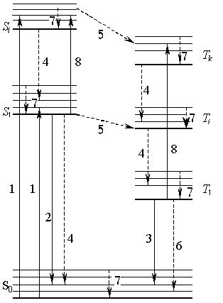 1 – поглощение; 2 – флуоресценция; 3 – фосфоресценция; 4 – внутренняя конверсия; 5 – синглет-триплетная конверсия; 6 – Т 1 – S 0 – конверсия; 7 – колебательная релаксация; 8 – синглет-синглетное и триплет-триплетное перепоглощение