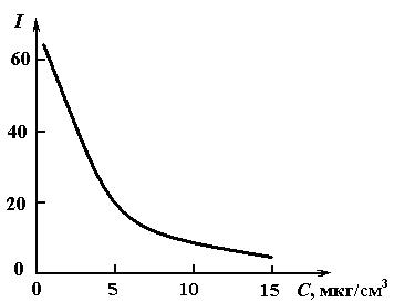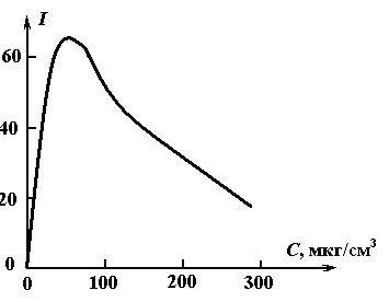 Зависимость интенсивности флуоресцентного излучения I от концентрации излучающего вещества С проходит через максимум. Для очень малых значений С (от 0 до 10–3 моль/дм3) наблюдается линейная зависимость