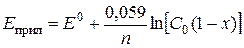 Полноту протекания электролиза можно предсказать исходя из при-ложенного потенциала и уравнения Нернста. Если считать, что начальная концентрация Оx равна C 0; Е 0 – стандартный электродный потенциал; х – доля Ох, восстановленного до Red при потенциале электрода Е,то при равновесии число молей Ох составляет С 0×(1 – х).