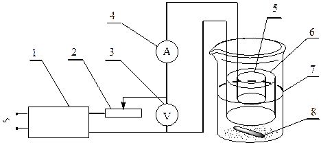 Оборудование: 1) платиновые сетчатые электроды – 2 шт.; 2) выпрямитель; 3) реостат; 4) амперметр; 5) вольтметр; 6) магнитная мешалка; 7) штатив с зажимом для крепления платиновых электродов; 8) цилиндры на 200 см3 (для воды), 100 см3 (для серной кислоты 1:1), 50 см3 (для азотной кислоты 1:1), 50 см3 (для 10%-ной азотной кислоты); 9) стакан на 300 см3 (ячейка), 150 см3 (для спирта); 10) промывалка; 11) ложечка и бюкс для взвешивания.