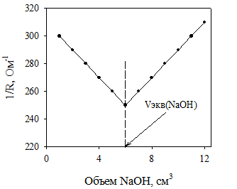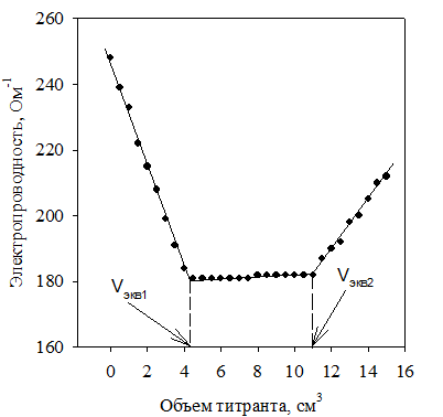 Первое титрование можно провести с повышенной скоростью, приливая по 2 см3 титранта. При последующих титрованиях вблизи точки эквивалентности порции титранта уменьшают до 1,0 – 0,5 см3. После точки излома определяют электропроводность еще в 4 – 5 точках. Титрование повторяют до получения трех сходящихся (т.е. различающихся не более чем на 0,1 см3) результатов. Из трех параллельных определений находят среднее значение эквивалентного объема раствора гидроксида натрия