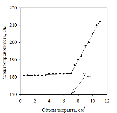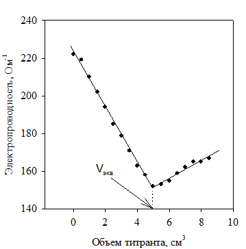 Строят график зависимости электропроводности от объема раствора NaOH (рис. 2.16). По резкому перегибу на кривой находят точку эквива-лентности, определяют эквивалентный объем титранта Vэкв(NaOH).