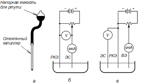 Рис. 2.19. Принципиальная схема полярографа: а – ртутный капающий электрод (РКЭ); б – двухэлектродная полярографическая ячейка; в – трехэлектродная полярографическая ячейка (РКЭ – ртутный капающий электрод, ВЭ – вспомогательный электрод, ЭС – электрод сравнения)