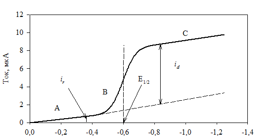 Полярограмма состоит из трех участков. Первый соответствует остаточному току при небольших отрицательных потенциалах электрода (рис. 2.22, участок А). Второй (участок В) отвечает току, контролируемому переносом заряда, при значениях электродного потенциала, соответствующих или превышающих потенциал восстановления Cd2+. На этом участке с увеличением потенциала ток растет экспоненциально. Скорость реакции контролируется ее кинетикой, и стационарный ток обеспечивается диффузией. Участок С соответствует предельному току, контролируемому скоростью диффузии.