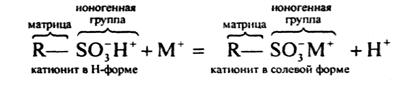 В рассматриваемом случае катионит в Н-форме (в Н+-форме, кислой форме) состоит из матрицы R (основа которой – органический полимер, полимерная смола) и ионогенной группы –SO3– H+. Отрицательно заряжен-ные группы –SO3– прочно связаны ковалентной связью с матрицей и в условиях ионного обмена отщепляться не могут. Напротив, противоионы – положительно заряженные катионы водорода Н+ – могут отщепляться от исходной ионогенной группы. Их замещают катионы металла М+, которые переходят из раствора в фазу сорбента и удерживаются в ионогенной группе –SO3– М+. В целом осуществляется катионный обмен, при котором катионы металла М+, ранее входившие в состав подвижной фазы – раство-ра, остаются на катионите, а катионы водорода Н+ переходят в раствор и уносятся подвижной фазой.