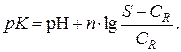 Величину α можно выразить как отношение CR / S, где CR – емкость при данном значении рН среды, ммоль экв/г; S – максимальная емкость ионита, ммоль экв/г. Тогда выражение для рК примет вид