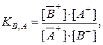 Ионообменный процесс можно рассматривать как гетерогенную химическую реакцию между активными группами ионообменника и ионами в растворе, протекающую в соответствии с законом действия масс. Поскольку ионный обмен – это гетерогенное равновесие, то оно, как и любое химическое равновесие, подчиняется общим термодинамическим закономерностям, поэтому выражение для истинной термодинамической (т.е. выраженной через равновесные активности) константы KВ, А этого рав-новесия имеет вид