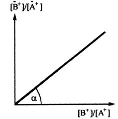 Из уравнения (3.3) следует, что отношение равновесных концентраций ионов в фазе сорбента прямо пропорционально отношению равновесных концентраций тех же ионов в растворе (рис. 3.2). Величина константы ионного обмена KВ, А определяется тангенсом угла наклона α прямой к оси абсцисс:
