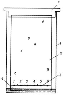 Рис. 3.5. Хроматографическая камера для качественного анализа смеси катионов металлов: 1– сосуд; 2 – крышка; 3 – лист хроматографической бумаги; 4 – растворитель; 5 – линия старта