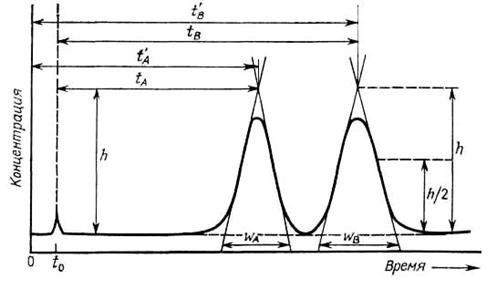 где t = tB – tA – разность времен удерживания разделяемых компонентов А и В; wA и wB – ширина пиков; wA, ½ и wB, ½ – полуширина пиков.