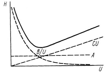 Рис. 3.8. Зависимость высоты, эквивалентной теоретической тарелке, Н от скорости подвижной фазы U.