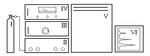 I – баллон с газомносителем; II – блок регулировки газовых потоков; III – блок программирования температуры колонки; IV – блок управления детектором; V – блок воздушного термостата хроматографической колонки; VI – самопишущий потенциометр