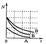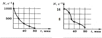 S: При исследовании превращения радиоактивного вещества в двух опытах с разной массой вещества было установлено, что число N частиц, образующихся в единицу времени при радиоактивном распаде, убывает во времени в соответствии с графиками