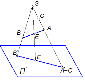 Центральной проекцией прямой линии является прямая линия. Пусть требуется спроецировать центрально данную прямую АВ в соответствии с рисунком 1.2.1. Проецирующие прямые SA и SB определяют на плоскости П′ проекции А′ и В′ соответственно точек А и В. Для любой другой точки Е прямой АВ проецирующая прямая SЕ определяет проекцию Е′. Все проецирующие прямые лежат в одной и той же (проецирующей) плоскости SAB. Поэтому все проекции точек данной прямой лежат на линии пересечения проецирующей плоскости SAB с плоскостью проекций П′ .