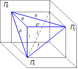 В начертательной геометрии различают прямые общего и частного положения. Прямые, наклонённые ко всем плоскостям проекций, называются прямыми общего положения (прямая l на рисунке 1.3.1). Прямые, перпендикулярные либо параллельные плоскости проекций, называются прямыми частного положения (прямые i, q, p ’, h, f, p в соответствии с рисунком 1.3.1).