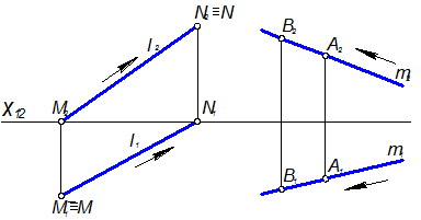 Прямая общего положения называется восходящей, если её проекции ориентированы одинаково (прямая l на рисунке 1.3.2), и нисходящей, если её проекции ориентированы противоположно (прямая m на рисунке 1.3.2). У прямой l ближайшая к наблюдателю точка М (наблюдатель предполагается стоящим лицом к плоскости П2) располагается ниже, чем более удалённая от наблюдателя точка N. Эта прямая по мере удаления от наблюдателя поднимается вверх (восходит). Прямая m по мере удаления от наблюдателя понижается (нисходит). Ориентация проекций восходящей прямой l и нисходящей прямой m обозначена стрелками.