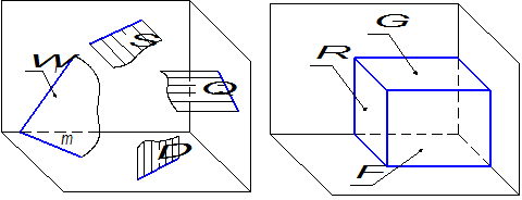 Как и в случае с прямыми линиями различают плоскости общего и частного положения. Плоскости, наклонённые ко всем плоскостям проекций, называются плоскостями общего положения (например, плоскость W на рисунке 1.3.12). Плоскости, перпендикулярные либо параллельные плоскости проекций, называются плоскостями частного положения (в соответствии с рисунком 1.3.12 это плоскости S, D, Q, Г, Ф, Р ).