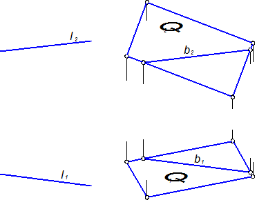 На комплексном чертеже это условие обеспечивается параллельностью соответствующих проекций прямой l и прямой b в соответствии с рисунком 1.3.21. Так, l 1 ||b 1 и l 2 ||b 2, следовательно, l||Q.
