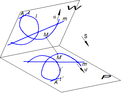 Допустим, что данная кривая l лежит в некоторой плоскости W. Спроецируем кривую l на плоскость проекций П¢ по направлению s в соответствии с рисунком 1.2.27. Тогда каждая точка М кривой l будет проецироваться в точку М¢ плоскости П¢. В результате на плоскости П¢ получится кривая l ¢ – проекция данной кривой l.