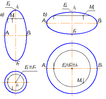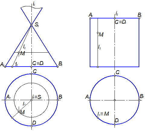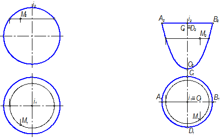 Положение точки на поверхности вращения второго порядка определяют при помощи параллели или (в случае конуса и цилиндра) прямолинейной образующей, проходящих через эту точку, в соответствии с рисунками 1.3.41, 1.3.42, 1.3.43, 1.3.44, 1.3.45.