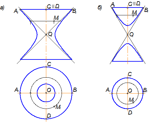д) двухполостный гиперболоид вращения, образуемый вращением гиперболы вокруг её действительной оси в соответствии с рисунком 1.3.44, б;