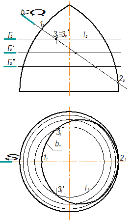 Построение линии b пересечения фронтально проецирующей плоскости Q с поверхностью закрытого тора выполнено в соответствии с рисунком 1.3.48. Для этого введён ряд вспомогательных горизонтальных плоскостей –посредников Г (Г2), Г¢ (Г¢2), Г¢ (Г¢2) и т.д. Плоскость Г (Г2) пересекает поверхность закрытого тора по окружностям l (l1,l2), а плоскость Q она пересекает по фронтально проецирующей прямой (3-3¢). Проекции этой прямой на чертеже обозначены следующим образом: горизонтальная – (31-3¢1) и фронтальная – (32º3¢2). Точки 3 и 3¢ в силу проецирующего положения плоскости Q являются одновременно и точками линии b как линии пересечения плоскости Q с данной поверхностью закрытого тора. Все другие точки линии b определяются аналогично точкам 3 и 3¢ при помощи плоскостей-посредников Г¢, Г¢ и т.д. Проекции линии b на чертеже обозначены следующим образом: фронтальная – b2ºQ2 и горизонтальная – b1, представляющая собой плавную кривую, соединяющую точки 3, 3¢ и т.д. Следует заметить, что при построении линии b в первую очередь надо отметить точки 1 и 2 как опорные. Положение этих точек при данном расположении на чертеже поверхности закрытого тора и плоскости Q определяется наличием общей плоскости симметрии S (S1), которая является плоскостью главного меридиана поверхности закрытого тора. Действительно, плоскостью симметрии плоскости Q (Q2) будет вообще любая плоскость, к ней перпендикулярная, а плоскостью симметрии поверхности будет всякая плоскость, проходящая через её ось. Общая плоскость симметрии должна удовлетворять обоим указанным условиям и очевидно, что такой плоскостью будет S (S1). В силу этого линия b тоже симметрична относительно плоскости S, а её горизонтальная проекция симметрична относительно следа плоскости S1. Точки 1 и 2 лежат на главном меридиане поверхности. Отметив их фронтальные проекции 12 и 22, найдём горизонтальные проекции этих точек (11 и 21) на горизонтальной проекции главного меридиана.