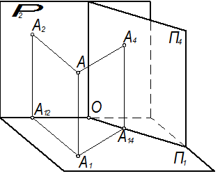 Спроецируем какую-либо точку А на эти плоскости и определим её проекции А1 и А2. Возьмём новую плоскость проекций П4, перпендикулярную к плоскости П1, и спроецируем точку А на эту плоскость, обозначив полученную проекцию А4. Как видно из рисунка 1.4.1, пара А1 и А4 при заданном положении плоскостей проекций П1 и П4 определяет в пространстве точку А.