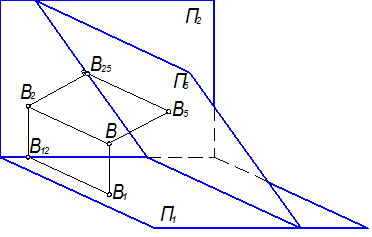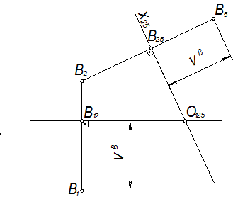 Операция перехода от системы (П1, П2) к системе (П2, П5) на комплексном чертеже показана на рисунке 1.4.4. Линия связи В2В5 перпендикулярна к новой оси х25.