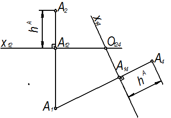 Проведём новую ось х14 и построим точку А14, опуская перпендикуляр из точки А1 на ось х14. На этом перпендикуляре откладываем отрезок А14А4=А12А2=hА. Полученная таким образом точка А4 является проекцией точки А на плоскость П4. О124 – точка, у которой все три проекции совпадают.