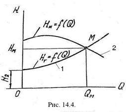Режим совместной работы сети с насосом находят графическим путём как точку пересечения характеристики насоса и характеристики сети (рис.12.4.)
