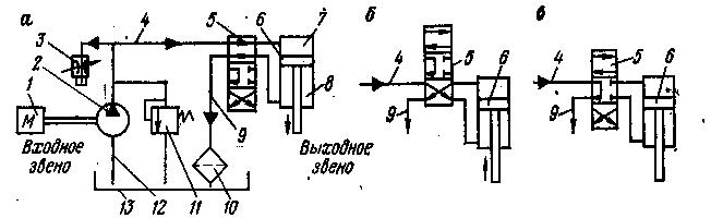 Обычно разомкнутая циркуляция жидкости применяется в многодвигательном гидроприводе с одним насосом (например, в механизированных крепях;, а также и гидроприводе с поступательным движением выходного звена (см. рис. 10.3, а),