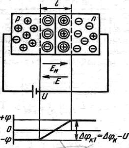 Электрическое поле источника напряженностью Еи направлено навстречу полю p-n перехода напряженностью Е, поэтому напряженность результирующего электрического поля Е1=Е-Еи . Уменьшение напряженности электрического поля в переходе вызовет снижение высоты потенциального барьера на значение прямого понижения U источника: