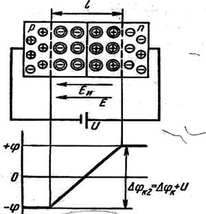 Увеличение напряженности электрического поля в p-n переходе повышает потенциальный барьер на значение обратного напряжения источника: