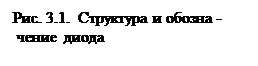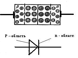 Электрический переход чаще всего образуется между двумя полупроводниками с разным типом примесной электропроводности (p- или n- типа), одна из областей (низкоомная) является эмиттером, другая (высокоомная) – базой. Структура диода и условное обозначение в схемах выпрямительного диода показаны на рис. 3.1.