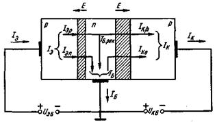 Через эмиттер помимо дырочного протекает и электронный ток IЭп, обусловленный переходом в область эмиттера электронов базы. Таким образом, ток эмиттера