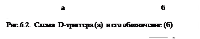 Схема синхронного D-триггера приведена на рис.6.2, а. На рис.6.2, б показано его условное обозначение. D-триггер имеет один информационный вход D, устанавливающий триггер в состояние, соответствующее логическому уровню на этом входе. Вход С является исполнительным (управляющим, синхронизирующим). Он служит для подачи синхронизирующего сигнала. Триггер состоит из асинхронного RS-триггера и логических переключающих устройств на входах (одного элемента НЕ и двух элементов И-НЕ).