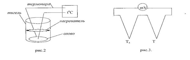 В качестве термометра, находящегося в непосредственном контакте с исследуемым веществом, используется термопара вместе с цифровым мультиметром. Термопара изготавливается из двух разнородных проводников. При их сварке получается «королек горячего» спая, который приводят в контакт с испытуемым телом. Возникающая термоЭДС пропорциональна разности температур Т «горячего» и Т а «холодного» спаев термопары. Ее измеряют при помощи милливольтметра (рис.3.). В данной установке роль «холодного» выполняют контакты проводов термопары с клеммами измерительного прибора (цифрового мультиметра), который имеет комнатную температуру, и микропроцессора, который пересчитывает величину термоЭДС в температуру «горячего спая» термопары, погруженного в олово с учетом комнатной температуры, на дисплее высвечивается температура олова в градусах Цельсия.