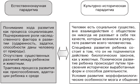 Культурно-историческая парадигма (теория) была разработана советским психологом Л. С. Выготским и получила дальнейшее развитие в трудах А. Н. Леонтьева. В основу ее были положены идеи французской социологической школы: историзма и социальной обусловленности психики. До этого в психологии существовала естественно-научная парадигма, отличия которой от парадигмы культурно-исторической показаны на рис. 1.9.