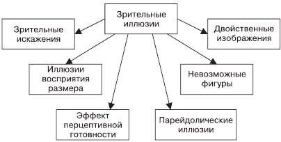 Иллюзии обусловлены различными механизмами работы зрительного анализатора или особенностями функционирования психики человека. Некоторые ошибки происходят на уровне глазодвигательного аппарата, другие обусловлены психологическими установками, третьи связаны с трудностями аккомодации на объектах различной удаленности, четвертые вызваны прежним опытом индивидуума и т. д. В связи с этим выделяют несколько разновидностей зрительных иллюзий (рис. 6.6). Ниже будут продемонстрированы их примеры.